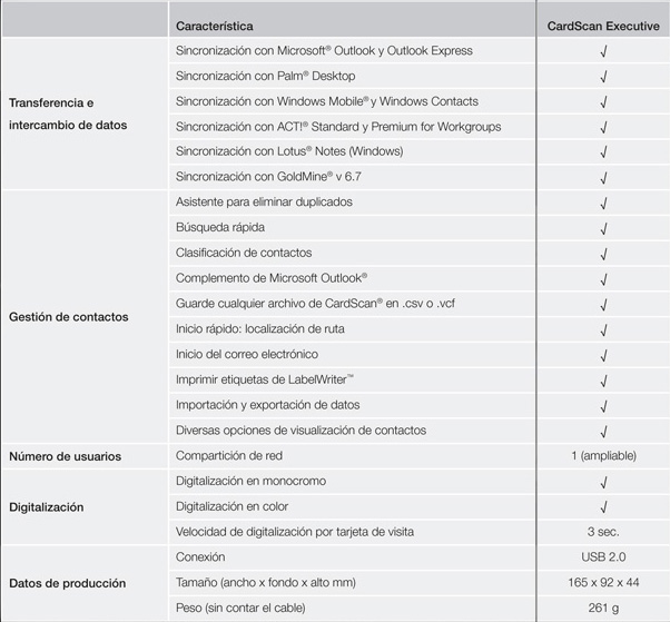 • Funciona con Outlook®, Palm®, Windows® Mobile y smartphones, además de ACT®, Lotus® Notes y GoldMine®
